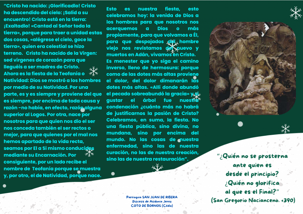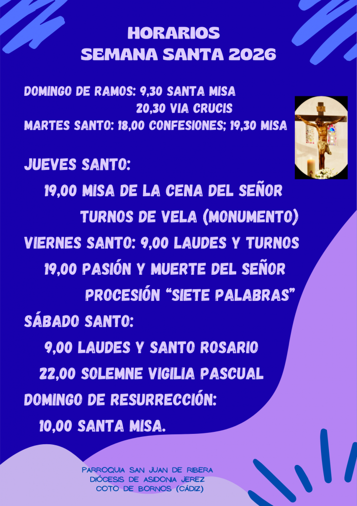 ADORACIÓN DEL SANTÍSIMO: De Lunes a Sábado, de 9,00 a 12,30h. «Yo soy la verdadera vid, y mi Padre es el labrador, …, el que permanece en mí y yo en él, ese da fruto abundante” (Jn 15, 1.5) «¡Viva el Santo Cristo del Buen Amor!» REFLEXIONES DE ADVIENTO Si quieres que tu casa sea bendecida, puedes solicitarlo a las Hermanas. Enlaces de interés: 40 días por la vida – El principio del fin del aborto Radio María Infinitomasuno.orghttps://magnificat.tvewtn tvhttps://www.hogardelamadre.org/es/Santa Sede Vaticano Anterior Siguiente Memoria de una Gracia, Vigilia de Espigas (17-18/06/2023) Enlace a DIÓCESIS de Asidonia Jerez Haz clic aquí DONATIVOS Haz clic aquí Para colaborar con el sostenimiento de tu parroquia Catequesis Donde el Señor te plante, florecerás y darás frutos Haz clic aquí LOCALIZACIÓN Parroquia San Juan de RiberaC/ Real, s/n.11649 COTO DE BORNOS (Cádiz) Contacto TLF: 6857487989 Email: cotobornosparroquia@gmail.com Alejandro. horarios Haz clic aquí